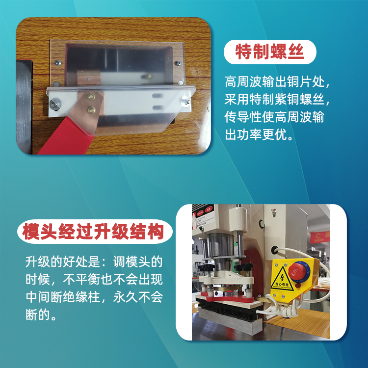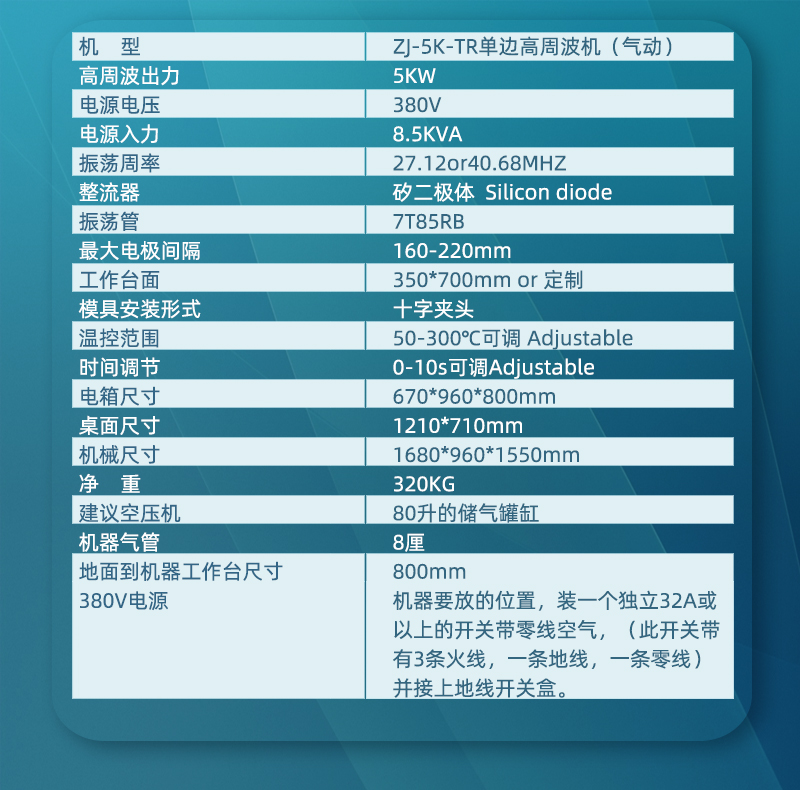 .jpg) 單邊高頻機型號為ZJ-5KW,此機器適合于PVC,商標,LOGO,皮革,暖水袋,PU材料,雨衣等。是一款腳踏式操作高周波機,振嘉牌單邊高頻機主要控件均使用歐、美、日原裝進口元器件,具有較高的穩定性,所有系統均為自主研發、制造。能根據不同的工件要求設計系統、模具等。分段式熔接、切斷,工件熔接后牢固性極強,如吸塑包裝切邊等熔接、切斷一次成型工件。此機特點是上下都有高周波出力,我司對客戶的樣板提供免費打板打樣,傳授產品生產整過程工序及提供生產方案,高頻機器質量已通過歐盟CE質量出口檢測,歡迎咨詢和洽談。13326711565