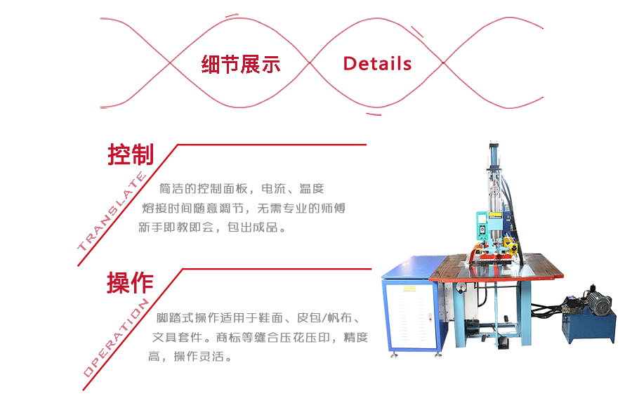 液壓腳踩高頻機主要采用高壓變壓器整流自激高頻電子管振蕩瞬間產(chǎn)生高頻電磁波電場,利用被加工的PVC、TPU、EVA、PET等塑膠、塑料原材料在高頻電磁波電場內(nèi)其被焊接塑膠、塑料材料的內(nèi)部分子產(chǎn)生極性化生熱,加上一定的壓力使所需要熱合焊接的塑料、塑膠產(chǎn)品達到熔接封口作用,廣泛用于PVC,商標,LOGO,皮革,暖水袋,PU材料,塑料、真皮、人造革、服裝等。液壓腳踩高頻機型號為:ZJ-8K-Y,主要控件均使用歐、美、日原裝進口元器件,具有較高的穩(wěn)定性,所有系統(tǒng)均為振嘉自主研發(fā)、制造。能根據(jù)不同的工件要求設計系統(tǒng)、模具等。分段式熔接、切斷,工件熔接后牢固性極強。