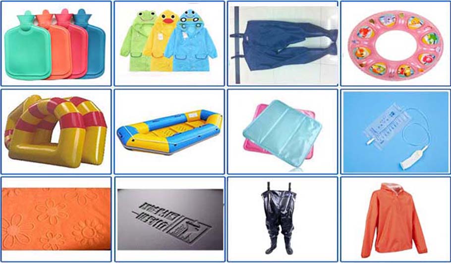 高周波機適用于PVC或含有30%以上之任何軟硬皮革,布類之熔接,壓痕需要,如鞋類,商標,車門栓,鐘表,電子,玩具,吹氣玩具,粘紙,雨衣,雨帆,雨傘,皮包,手替袋,文具,名牌,吹氣 玩具,水床,汽車坐墊,遮陽板,鎖類,五金,工具,商標等特殊硬殼真空包裝,尤其著重配合客戶的需求,加以設計施工。
