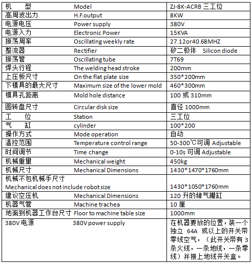 全自動高頻熱熔機型號為ZJ-8K-ADRB4,全自動高頻熱熔機質量已通過歐盟CE質量出口檢測;我司對客戶的樣板提供免費打板打樣,傳授產品生產整過程工序及提供生產方案, 全自動高頻熱熔機以自動轉盤方式操作,上下模對位準確,操控簡單易懂。本機配有觸摸屏控制整機動作、內置PLC工控集成系統,可便于以后更改機械控制程序或擴展其它機械應用功能、此系統符合機械操作應用、也是現代化機械之趨勢。