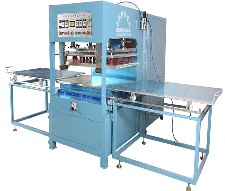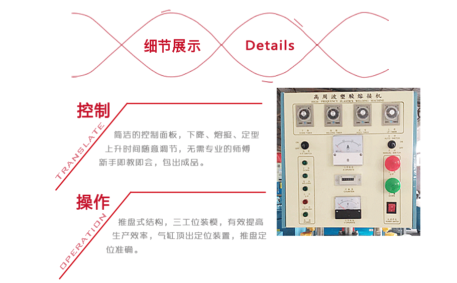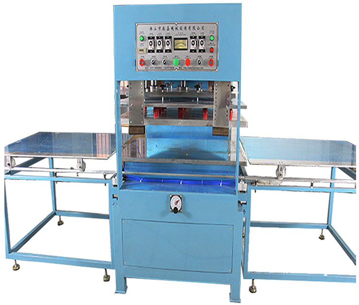 工作臺面板分左右推盤左右兩邊,操作方式是由推盤左右操作交替使用。熱合焊接過程全部由時間控制,設備設有四個時間制(下降延時---高周熔接----冷卻定型-----上升時間)。