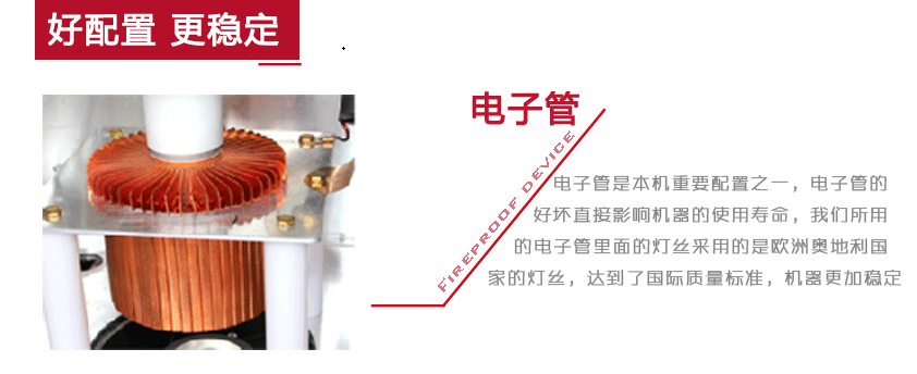 高頻機(jī)的價(jià)位在1萬起步到十幾萬左右都有,根據(jù)不同的機(jī)型和功率,價(jià)位都有所差別,市面上5千瓦或以上的高頻機(jī)較多,舉例5千瓦起步價(jià)在1萬塊多,這個(gè)價(jià)位的5千瓦高頻機(jī)配置上基本看得過去,那么高頻機(jī)主要的配置有哪些呢,小編認(rèn)為以下三種配置為高頻機(jī)首要配置,有電子管,變壓器,防火花裝置等,國內(nèi)比較有名的電子管廠家有華光或景光,我司采用的是華光電子管,這里要重點(diǎn)講一下為什么采用華光電子管,近年來,華光電子管里面的燈絲采用歐洲奧地利國家的燈絲,質(zhì)量非常穩(wěn)定,相對來說比景光電子管略勝一籌~ 以下是電子管照片: