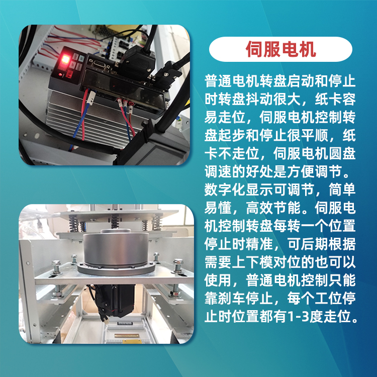 ④普通電機的靠感應器控制圓盤停止位置不準確,如果吸塑在紙卡上兩邊突起來就不能用上下模,伺服電機控制的停止位精準,能裝上下模。