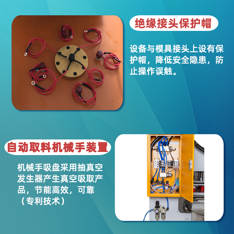 全自動吸塑封口機帶有自動取料及自動放紙卡的雙機械手吸塑封口機,工作臺可以放置4套模具。