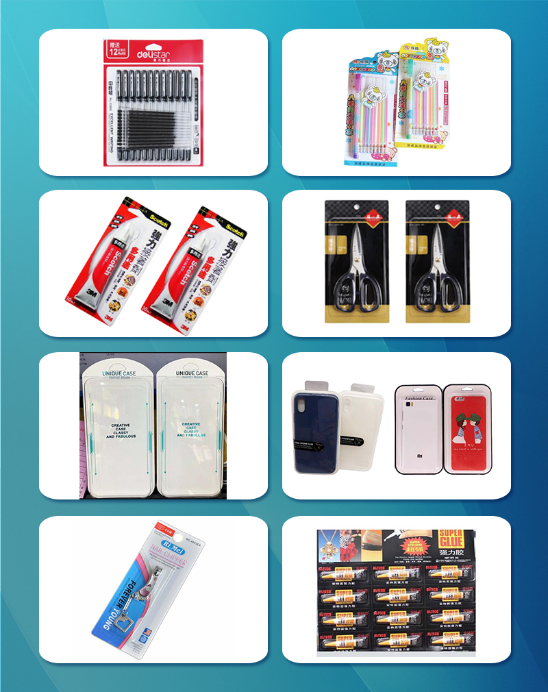 本產品適用于PVC、PET、PP等吸塑泡殼與紙卡的封合包裝。可廣泛用于玩具、文具、日用品、電器元件、手機殼、電池、五金和塑膠制品等多種產品的封合包裝,使被包裝的產品優點一目了然。